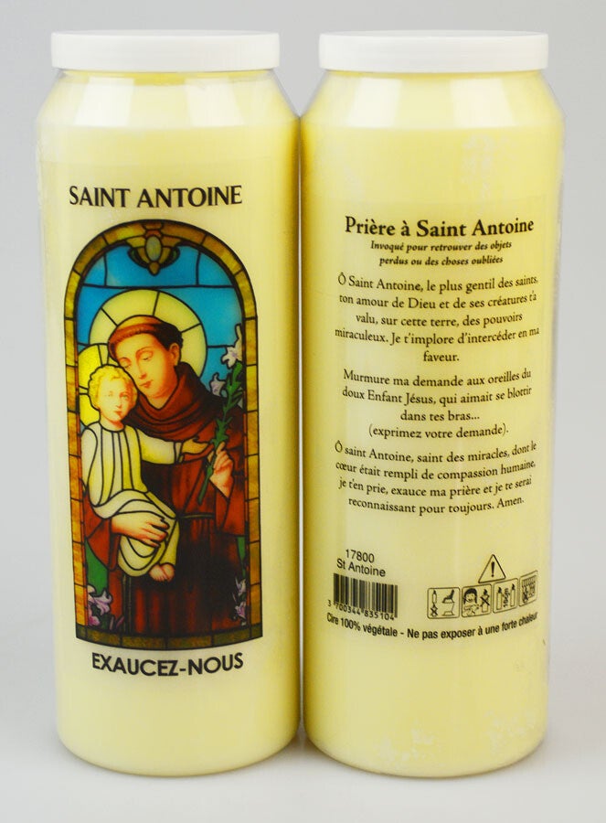 Bougie de Neuvaine Saint Antoine, cette bougie de neuvaine Saint Antoine de Padoue vous permettra de réciter votre neuvaine durant 9 jours. La neuvaine à Saint Antoine est destinée à tous ceux qui ont perdu quelque chose de précieux à leurs yeux. Saint Antoine de Padoue, fêté le 13 juin, aurait en effet retrouvé des manuscrits dérobés dans une grotte près de Brive-la-Gaillarde. Saint Antoine est également invoqué pour tous les miracles et guérisons accomplies, pour lesquels il a été canonisé seulement 11 mois après sa mort.